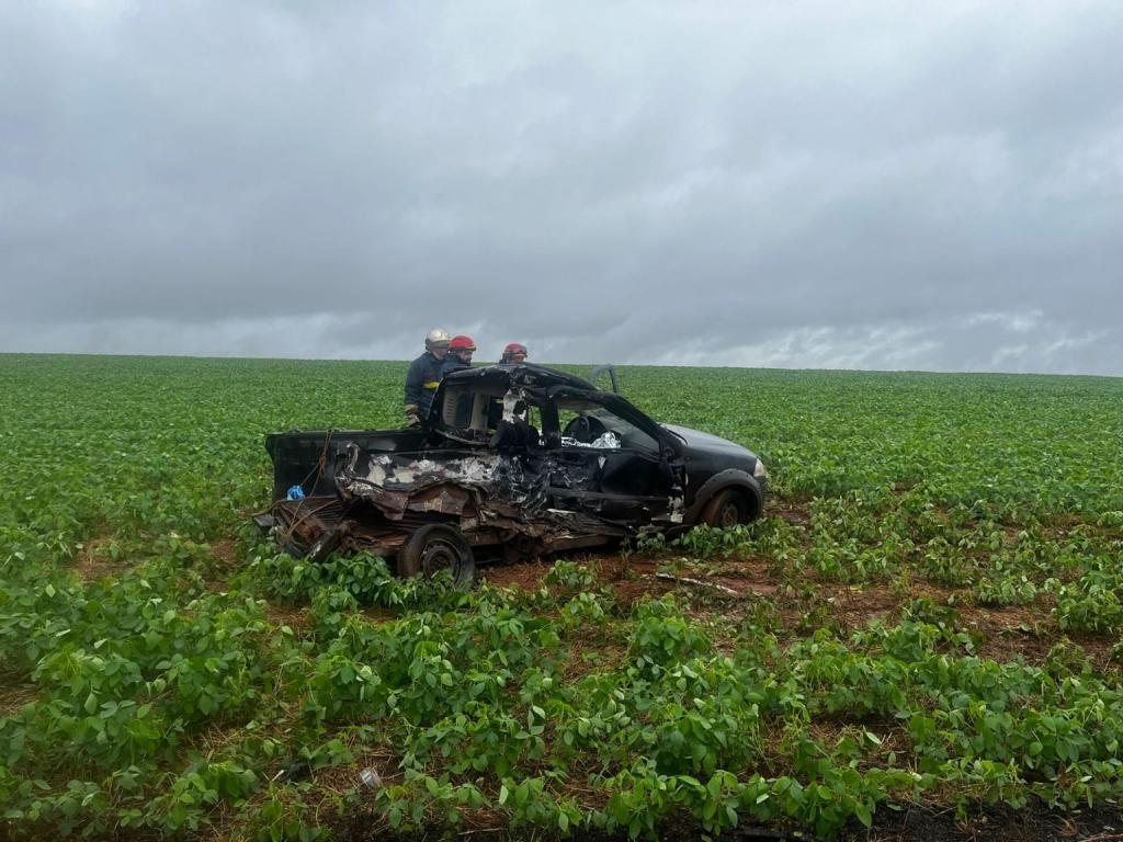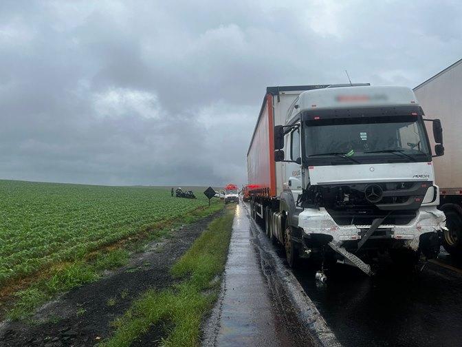 Segundo informações do condutor do caminhão, a camionete aquaplanou na pista molhada e foi de encontro ao caminhão e após a colisão foi parar em uma lavoura na margem da rodovia.