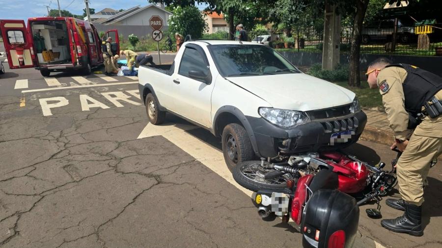 Um grave acidente de trânsito foi registrado nesta segunda-feira (13), em Marechal Cândido Rondon. A colisão envolveu uma picape Fiat Strada e uma moto Yamaha YBR, e aconteceu no cruzamento das ruas Pará e Sete de Setembro.