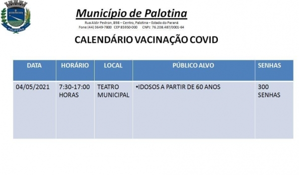 A equipe da Secretaria Municipal de Saúde de Palotina informa que nesta terça-feira (4), vai iniciar a vacinação contra Covid-19 para o ultimo grupo de idosos a partir dos 60 anos de idade. Para melhor organização, a equipe da Secretaria vai distribuir 300 senhas.