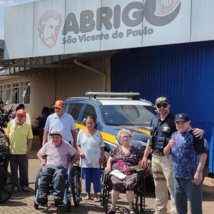 Nossos policiais estiveram no Abrigo São Vicente de Paula, em Cascavel, que atende idosos em situação vulnerabilidade, vários deles vítimas de violência, negligência e abandono familiar; e no intuito de proporcionar um dia diferente, realizaram a seguinte atividade, levar um grupo de 19 idosos para um passeio pela cidade de Cascavel, em nossas viaturas caracterizadas.