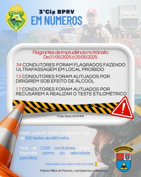 A 3ª Companhia da Polícia Militar Rodoviária (BPRv), que atua na fiscalização de 1.800 quilômetros de rodovias estaduais em toda a região Oeste do Paraná, divulgou nesta semana um balanço das infrações de trânsito registradas entre os dias 1º e 25 de maio de 2025.