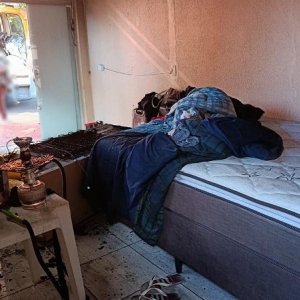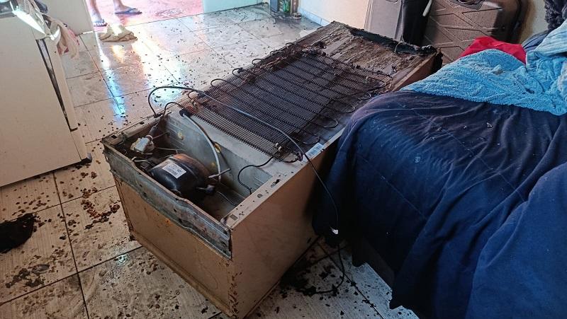Apesar dos danos à geladeira e ao forro, outros móveis, como o fogão e a cama, não foram afetados.