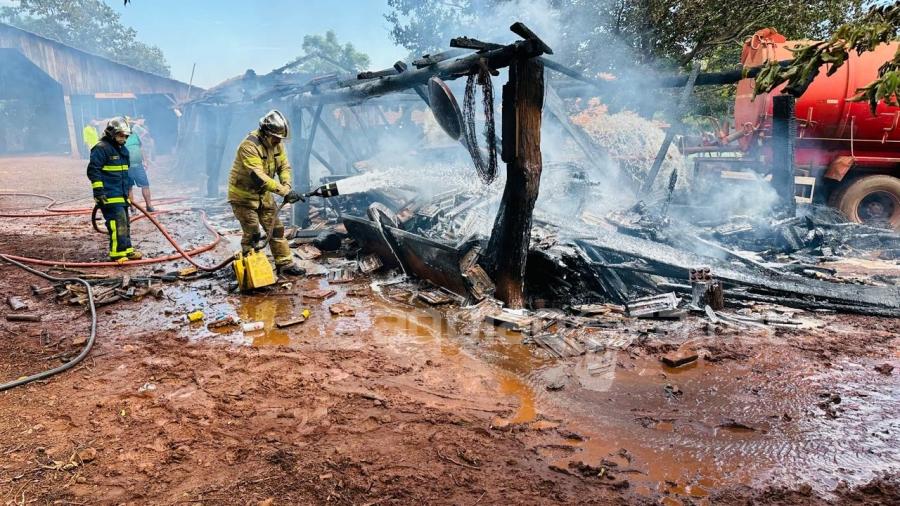 O fogo consumiu um galpão de madeira na Linha Wilhelms, distrito de Margarida. O local servia para estocar lenha e teve a estrutura completamente destruída.