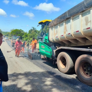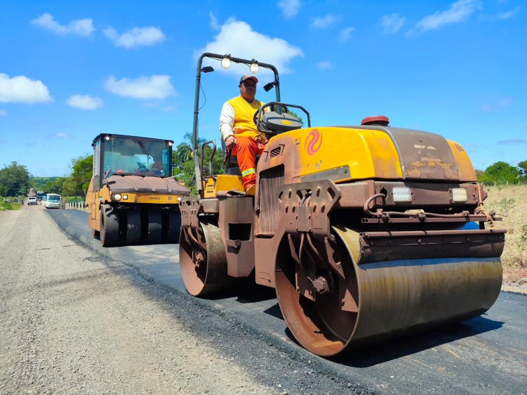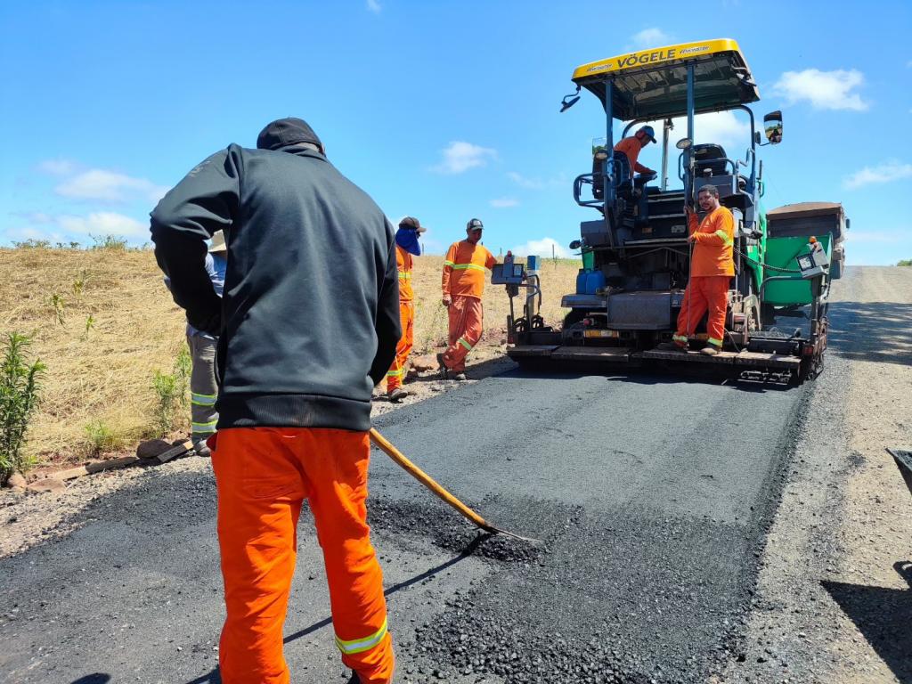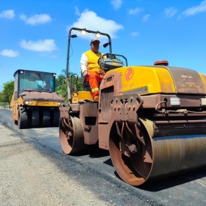 Antes de receber o revestimento em camada de asfalto CBUQ, servidores da prefeitura executaram a estrutura com uma base de 15 cm de rachãozinho, mais sub-base de 15 cm de pedra graduada compactada.