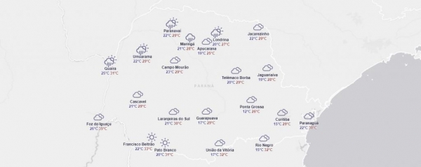 Em Toledo e Marechal Rondon, a variável de temperatura para esta segunda-feira será de 28°C a 23°C, em Palotina a máxima deve chegar a 29°C e a mínima de 24°C, segundo informações do Simepar.