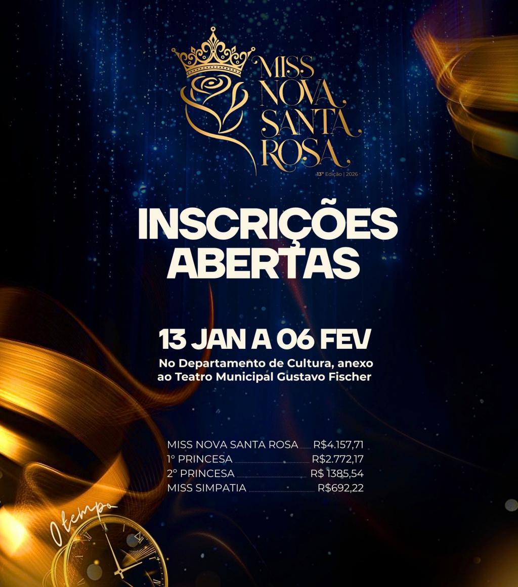 Estão abertas as inscrições para o 13º Concurso Miss Nova Santa Rosa 2026, que elegerá a representante do município para fins culturais, institucionais e de divulgação oficial, integrando a programação comemorativa dos 50 anos de emancipação político-administrativa de Nova Santa Rosa.