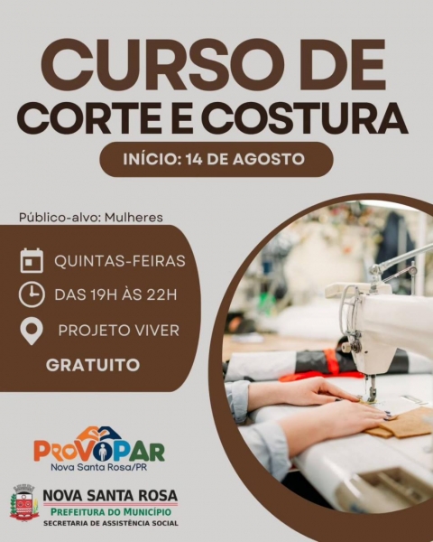 A Prefeitura de Nova Santa Rosa, por meio da Secretaria de Assistência Social e Provopar, informa que está com as inscrições abertas para o curso de corte e costura.