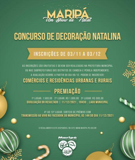 Encerra às 17h desta sexta-feira (3) o prazo para que comerciantes e moradores de Maripá façam a inscrição no Concurso de Decoração Natalina. As inscrições são gratuitas e devem ser feitas no Setor de Protocolo da Prefeitura ou nas Subprefeituras dos distritos de Candeia e Pérola Independente.