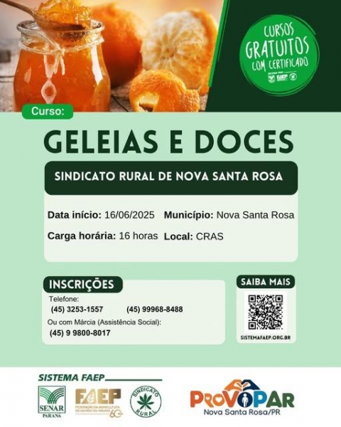 Será realizado em Nova Santa Rosa, o curso de geleias e doces voltado para produtores e trabalhadores rurais, além de integrantes da família do produtor rural. O curso é uma ação do Sindicato Rural, em parceria com o Provopar.