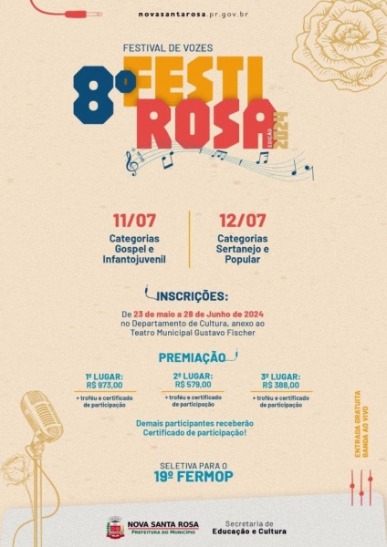 O Departamento de Cultura da Prefeitura de Nova Santa Rosa, informa que as inscrições para o 8º Festirosa – Festival de Vozes de Nova Santa Rosa, podem ser feitas até às 17h do dia 28 de junho.