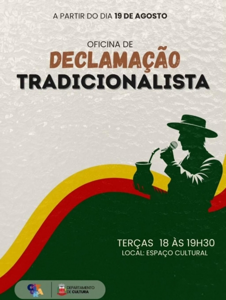 O Departamento de Cultura de Nova Santa Rosa convida a comunidade para participar da oficina de Declamação Tradicionalista. A atividade busca valorizar a cultura gaúcha e, ao mesmo tempo, desenvolver habilidades como entonação, ritmo, dicção, postura, gestos e expressões faciais.