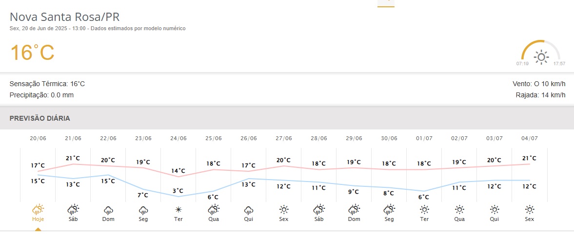 O inverno no Hemisfério Sul tem início oficialmente às 23h42 (horário de Brasília) de hoje (20), e já chega trazendo características típicas da estação para Nova Santa Rosa. Conforme os dados do Simepar atualizados às 13h desta sexta-feira, a previsão do tempo para os próximos dias indica queda nas temperaturas, com mínimas que podem chegar a 3°C na próxima terça-feira (24).