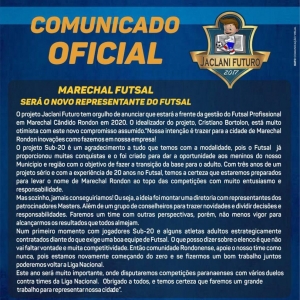 Através de nota oficial divulgada na tarde desta quarta-feira (22), o empresário Cristiano Bortolon anunciou oficialmente que a Jaclani Esportes estará à frente do projeto em 2020 e pediu o apoio da comunidade Rondonense. “Apoie nosso time como nunca, pois estamos novamente começando do zero e se fizermos um bom trabalho juntos, poderemos voltar à Liga Nacional de Futsal”.