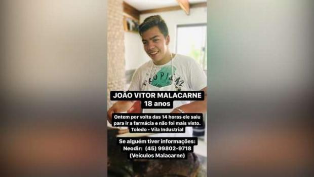 Está desaparecido desde segunda-feira (3) o jovem de 18 anos, João Vitor Malacarne.