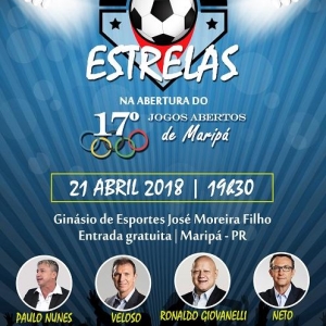 Em sua 17º edição, os Jogos Abertos de Maripá tem sua abertura marcada para este sábado (21), às 19h30 no Ginásio de Esportes José Moreira Filho. Além do desfile das oito delegações, será realizado o Jogo das Estrelas, com a participação dos craques do futebol brasileiro Neto, Ronaldo Giovanelli, Paulo Nunes e Veloso. A entrada será gratuita e os times serão completados com jogadores da cidade.
