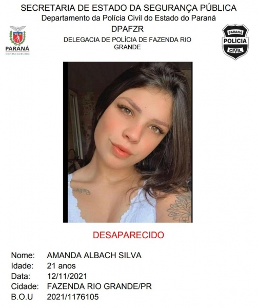 Amanda Albach viajou com um casal de amigos para passar o feriado de 15 de novembro em Imbituba, litoral de Santa Catarina, e não foi mais vista. As Polícias Civis do Paraná e Santa Catarina investigam o caso.