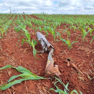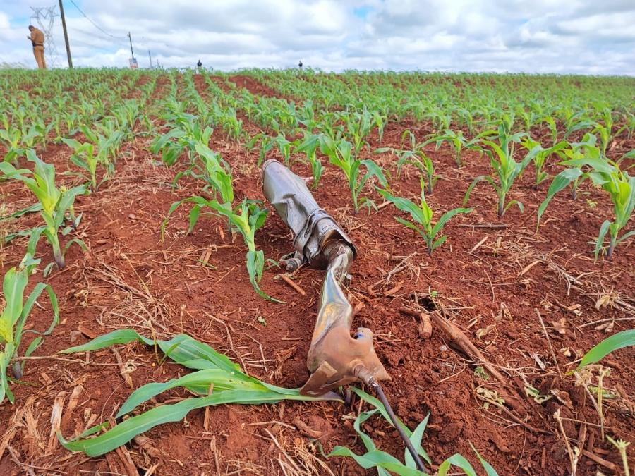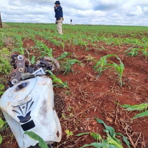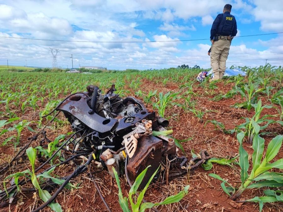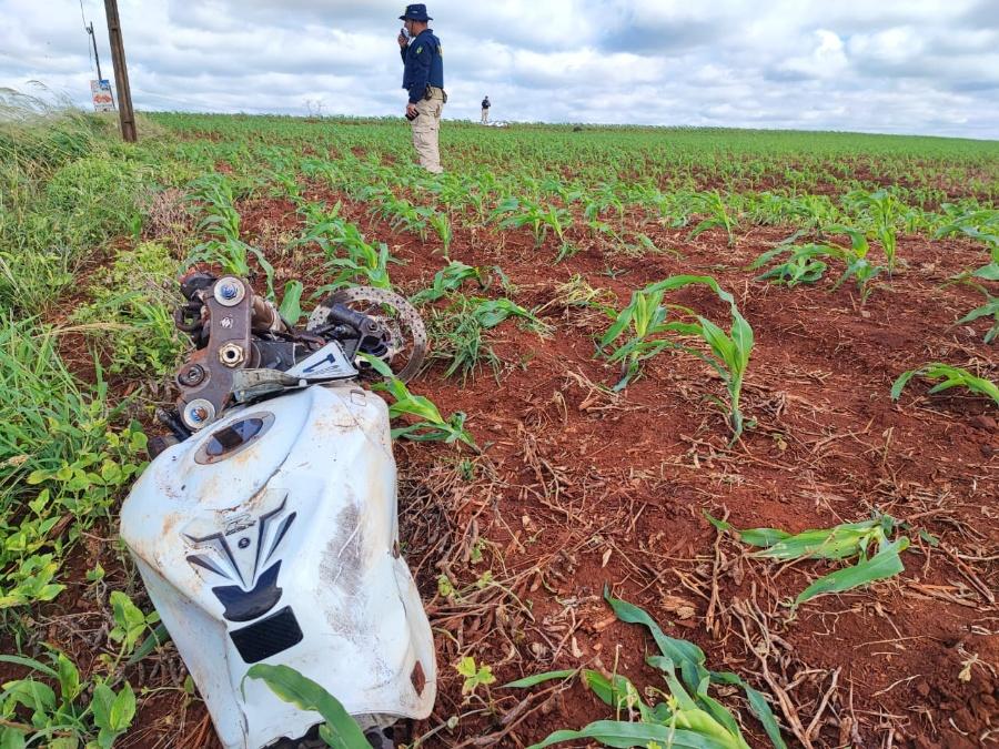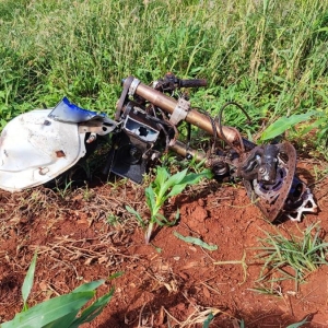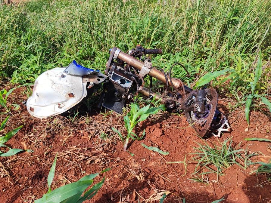 A moto ficou completamente destruída e os destroços espalhados pela lavoura. O motor da Suzuki parou próximo ao corpo da vítima.
