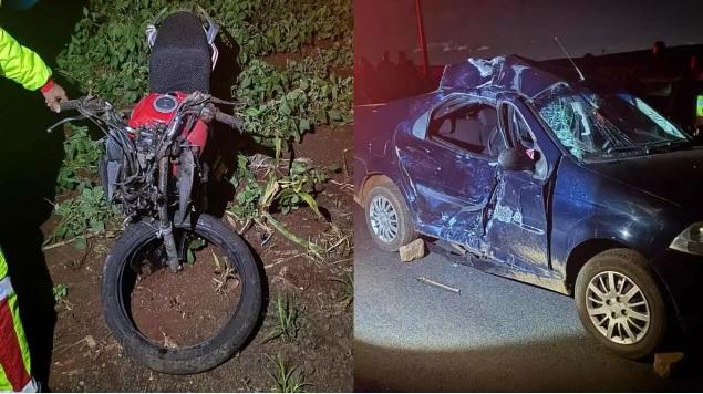 Duas pessoas morreram e uma ficou ferida em um grave acidente de trânsito na noite de quarta-feira (11), na PR-090, em Sertanópolis, no norte do Paraná. A colisão envolveu uma motocicleta e um automóvel Fiat/Siena. O condutor da moto e uma passageira do carro morreram no local.