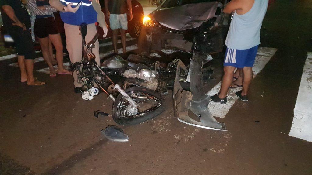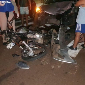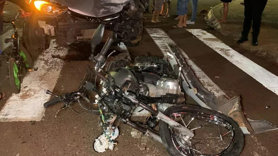 A pancada foi tão forte, que o motociclista foi parar de um lado da rua, o carro e a moto do outro lado do cruzamento.