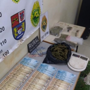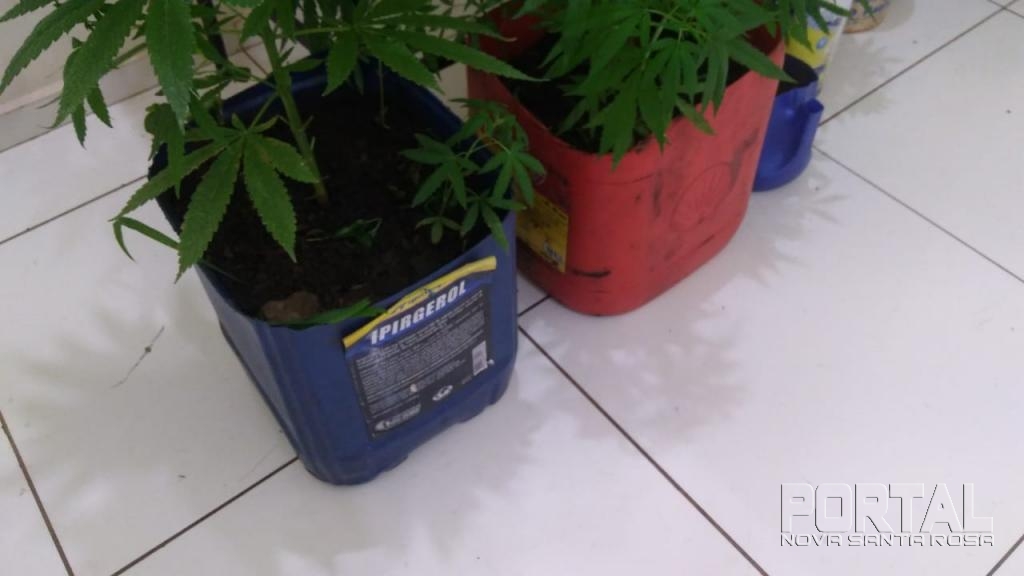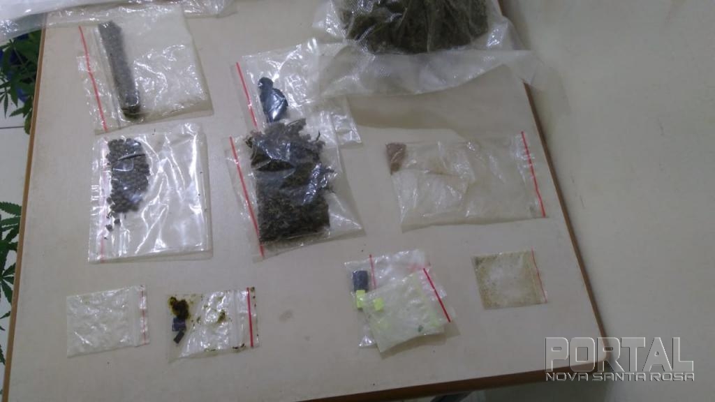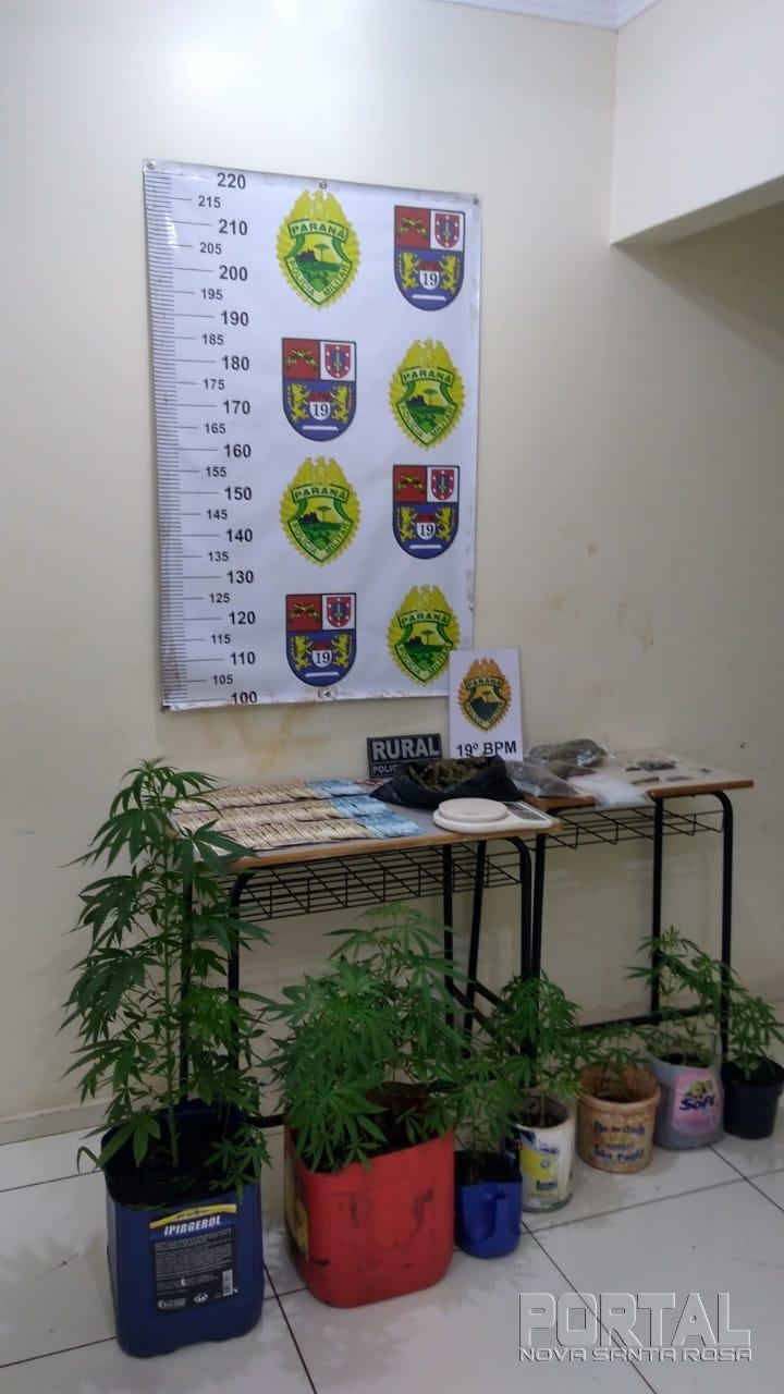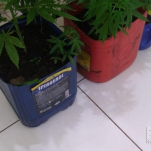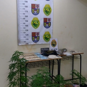Com apoio Patrulha Rural foi feita verificação do imóvel, onde na parte externa nos fundos, foram encontrados 7 vasos com 19 plantas de maconha, já no interior, foram encontrados em cima da mesa uma balança de precisão, uma bacia contendo "capulho" (flor da cannabis o qual tem grande valor agregado no mercado) também dentro da bacia estavam alguns pacotes transparentes utilizados para embalar o entorpecente, dentro do sofá foram encontradas duas embalagens contendo em seu interior "capulho" embalado a vácuo, 4 gramas de haxixe, dois pacotes de zip lock, um contendo ecstasy e outro três pontos de LSD, também foram encontrados 3 gramas de sementes de maconha.