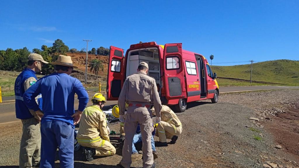 O motociclista sofreu escoriações e possível fratura em uma das mãos, sendo encaminhado ao hospital para atendimento médico.
