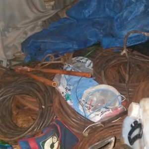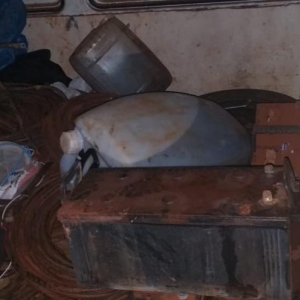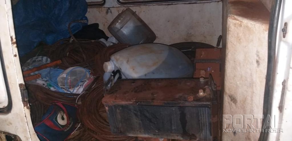 Em revista ao veículo de placa foi constatado que o vidro traseiro estava encoberto com uma cortina, e em seu interior havia grande quantidade de rolos de fio de cobre recentemente cortados, um alicate de cortar corrente, 4 (quatro) baterias, 3 (três) galões plásticos contendo aproximadamente 80 (oitenta) litros de óleo diesel, e ferramentas diversas, sendo os objetos possível produto de furto.