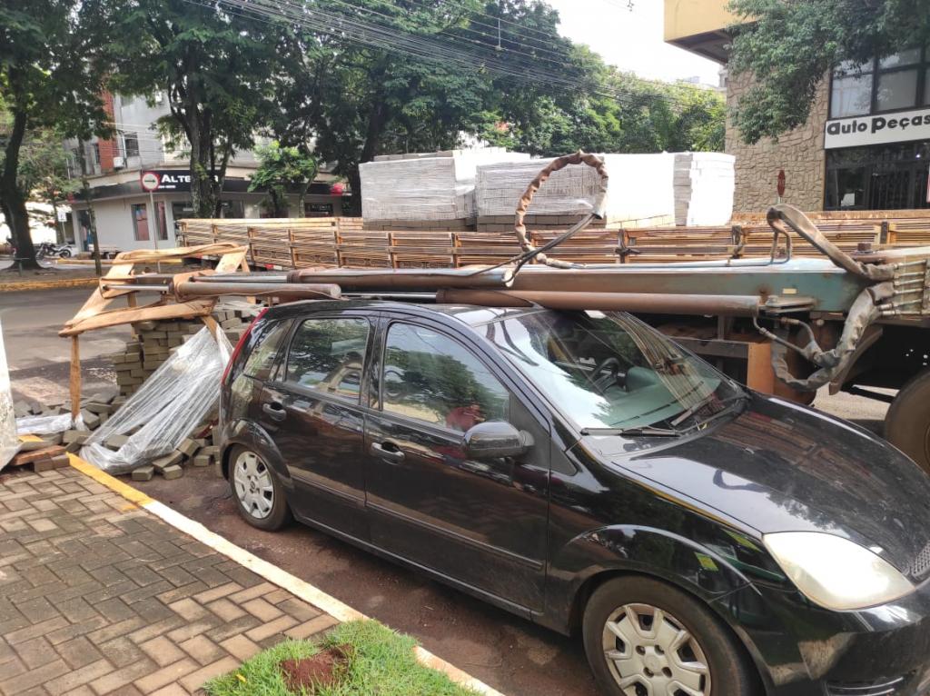 Durante a descarga de pavers em uma empresa, a lança de um caminhão Munck quebrou e caiu sobre um carro que estava estacionado ao lado do caminhão.