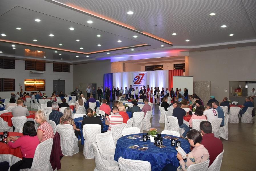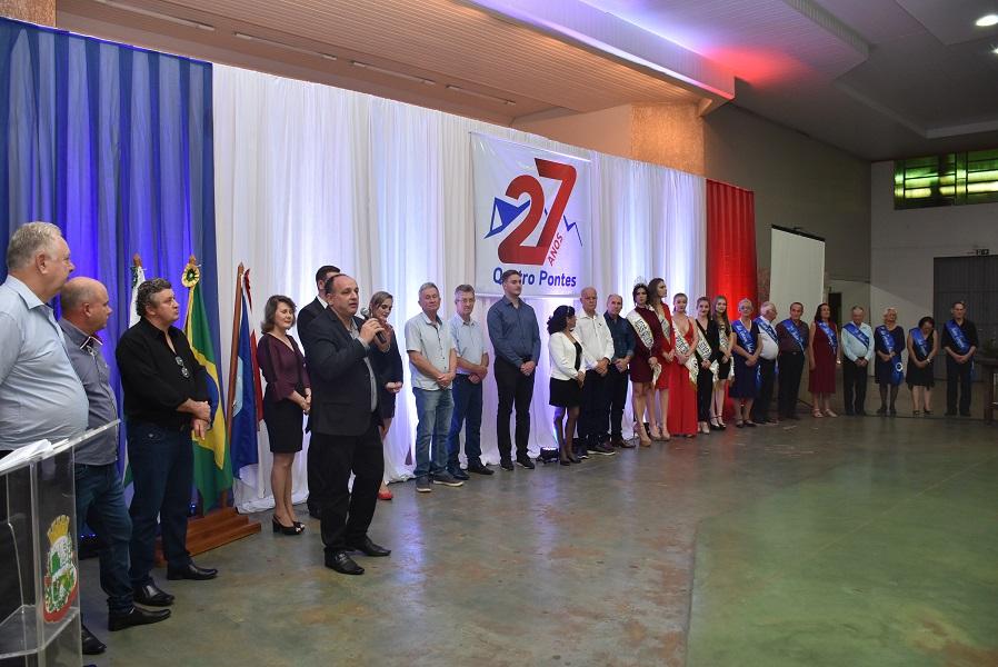 A festividade de Quatro Pontes, em comemoração ao 27º aniversário de emancipação político-administrativa, foi lançada oficialmente na noite de ontem (1º). A cerimônia aconteceu junto ao Clube Cultural, reunindo autoridades municipais, regionais, civis e militares, vereadores, secretários municipais, apoiadores oficiais, representantes de 17 associações, da beleza feminina e da terceira idade, além da imprensa. Por ocasião, foi apresentada a programação completa do evento, que ocorrerá entre os dias 12 e 15 de setembro, com destaque para o show nacional gratuito com Marcos e Belutti.