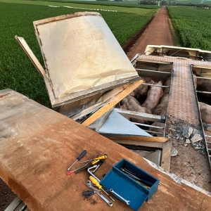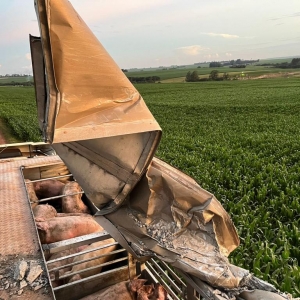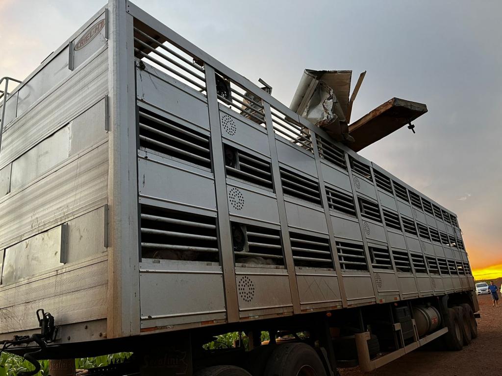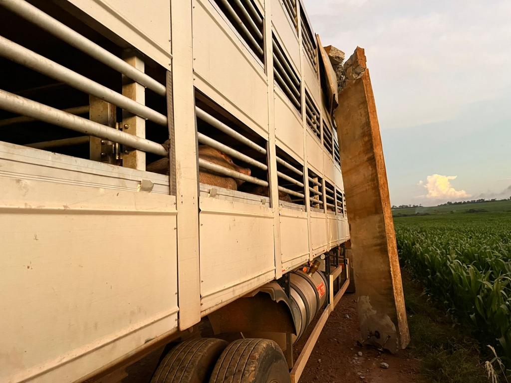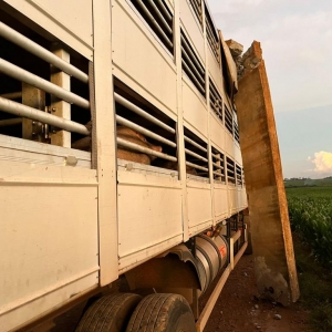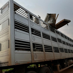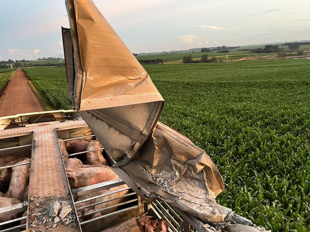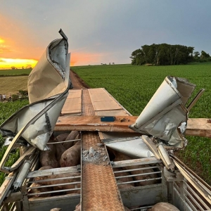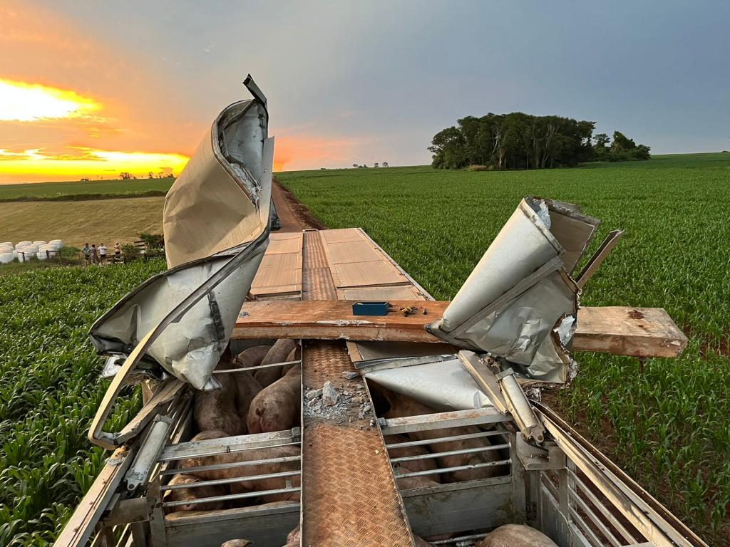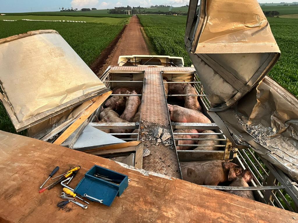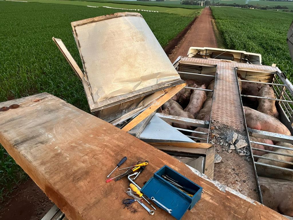 Uma carreta gaiola acoplada em um cavalo Volvo usada para o transporte de suínos sofreu um acidente no interior do município de Nova Santa Rosa, estrada que da acesso a Linha Brasil no início da noite desta terça-feira.