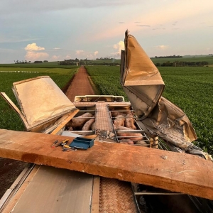 Ao sair da propriedade rural após realizar uma carga de suínos a carreta enroscou em um portal de entrada na propriedade, levando boa parte do portal e o restante ficou ao chão.
