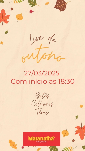 A Maranatha Calçados de Nova Santa Rosa realizará nesta quinta-feira (27), a partir das 18h30, uma Live especial de Outono. Serão botas, coturnos e tênis com preços incríveis. Não deixe de aproveitar em! Todos estão convidados a acompanhar mais esta transmissão que é sempre um sucesso.