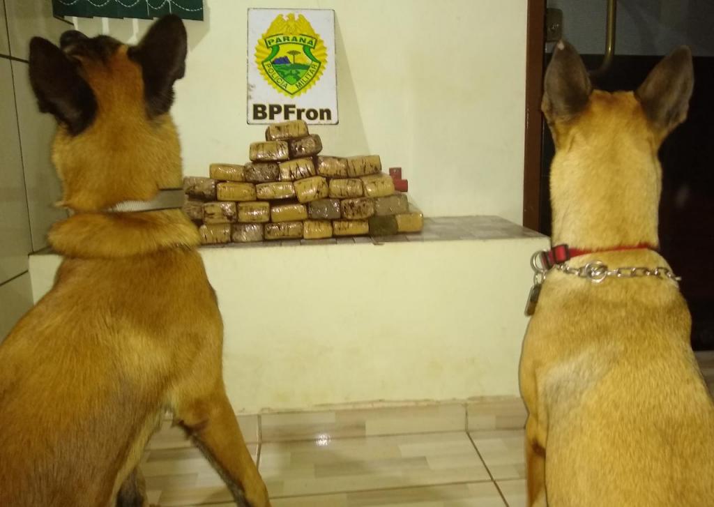 Dois cães farejadores do canil do BPFRON empregados nessa ação localizaram duas malas com tabletes de substância análoga a maconha. Após pesagem, a droga totalizou 20,00 kg.