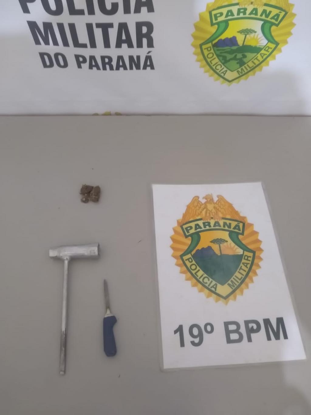 Durante patrulhamento na região do Lago Municipal, na rua Nicolau Primeiro foi abordado um Megan, na busca pessoal foi encontrada no bolso direito da bermuda da moça 0,4 gramas de maconha, no veículo foi encontrado em um compartimento localizado atrás do banco do motorista dois instrumentos que são utilizados em furtos de veículos e motocicletas (michas).