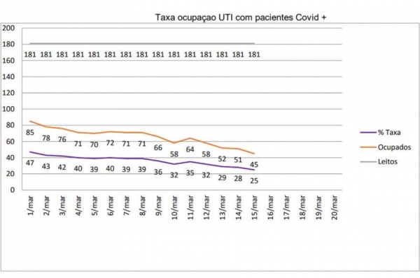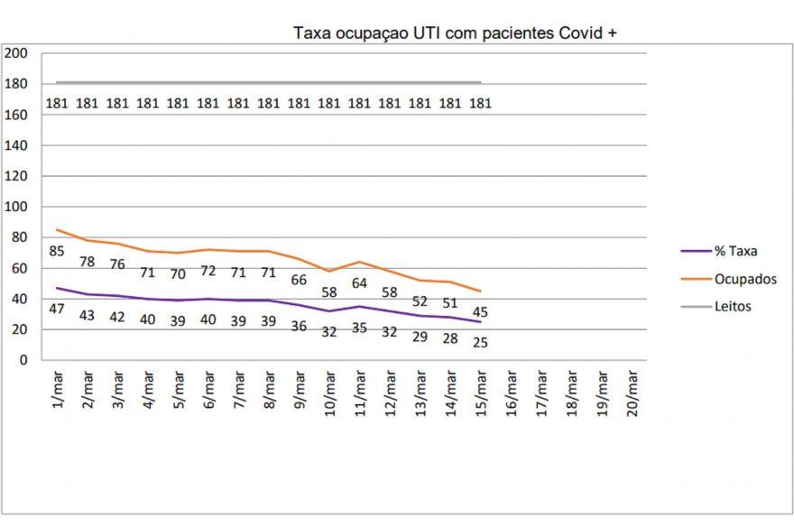 Conforme o relatório, a ocupação geral é de 24,9%, sendo que, dos 181 leitos disponíveis, 45 estão ocupados.