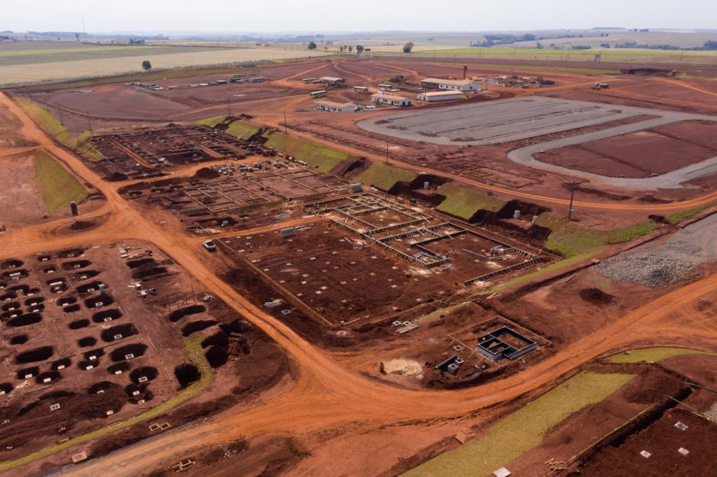 O maior frigorífico de suínos da América Latina começa a ganhar forma, em Assis Chateaubriand, no Oeste do Paraná. A terraplanagem nos 115 hectares é concluída enquanto a fundação, uma das bases do projeto, está em plena evolução. São R$ 2,5 bilhões em um investimento que promete ampliar ainda mais o protagonismo da região como uma das maiores produtoras de carne suína e derivados do Brasil.