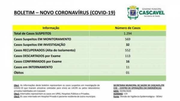 A Secretaria de Saúde de Cascavel divulgou na manhã desta sexta-feira (3) atualização do boletim do novo coronavírus (covid-19) no município.