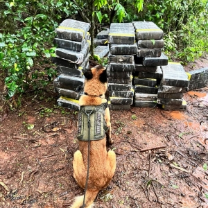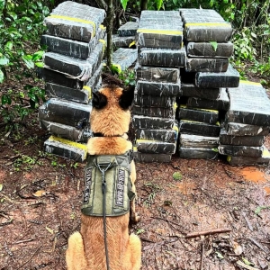 Policiais do Batalhão de Polícia de Fronteira realizavam patrulhamento em portos clandestinos em Santa Helena nesta quinta-feira quando o cão farejador do Pelotão de Operações com Cães do BPFRON indicou a presença de ilícitos em uma determinada região de mata.