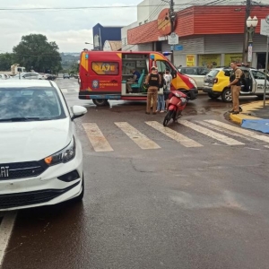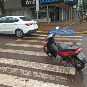 Uma moto Honda Biz 125 cilindradas, com placa de Tupãssi, conduzida por uma mulher de 50 anos, colidiu com um veículo Fiat Cronos, placas Mercosul, no centro de Toledo, às 14h00 desta tarde de segunda-feira (07).