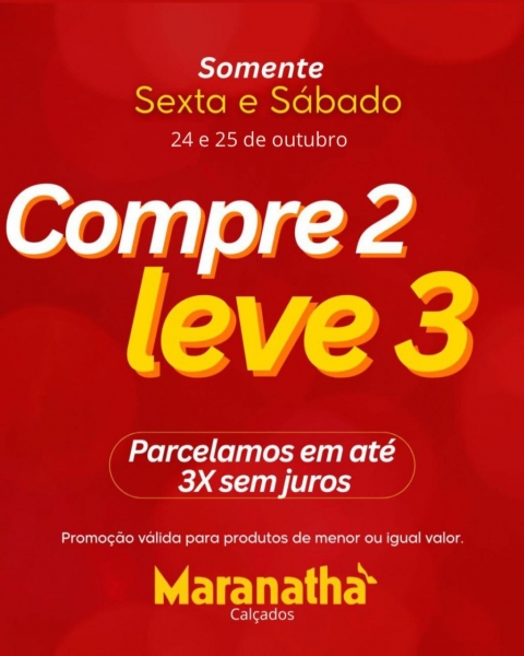 A loja Maranatha Calçados, de Nova Santa Rosa, preparou uma promoção imperdível para este fim de semana. Somente nesta sexta e sábado (24 e 25 de outubro), os clientes poderão aproveitar a campanha “Compre 2 e leve 3”, válida para produtos de menor ou igual valor.