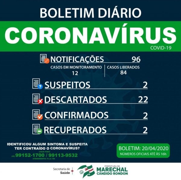 Nesta segunda-feira (20), a Secretaria de Saúde de Marechal Cândido Rondon, por meio do Setor de Vigilância Epidemiológica, divulgou mais um boletim com relação aos números do novo coronavírus.