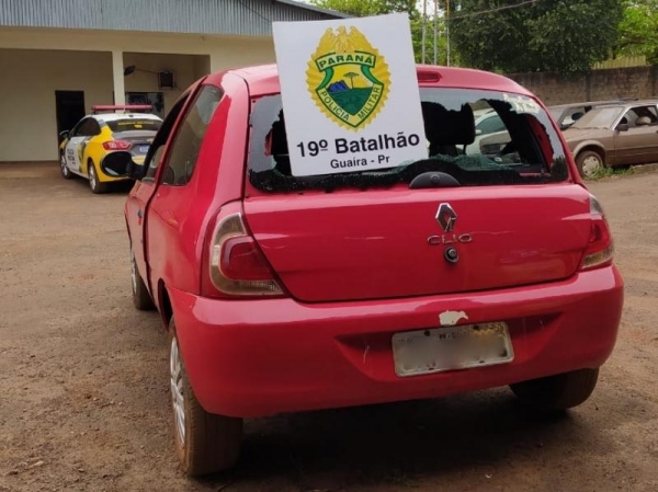 Após tomar conhecimento do fato, os policiais iniciaram buscar e encontraram o Clio abandonado. O veículo estava com o vidro traseiro quebrado e uma marca de tiro no banco do passageiro.