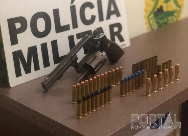 Foi localizado um revólver da marca Taurus, calibre 38 com 6 munições intactas no tambor. Diante do flagrante, foi retirado a arma da cintura e feito uso de algemas do pai de família.
