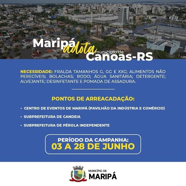 O município de Maripá adotou o município de Canoas, no estado do Rio Grande do Sul, para o auxílio com envio de donativos após as enchentes que ocorreram recentemente. A campanha solidária vai arrecadar itens específicos solicitados pela Defesa Civil.