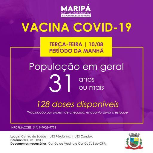 Com a chegada da 35ª remessa de vacinas contra a covid-19, o Município de Maripá irá ampliar a vacinação para pessoas com 31 anos ou mais nesta terça-feira (10). O novo lote contém 128 doses de vacinas fabricadas pela AstraZeneca e Pfizer.