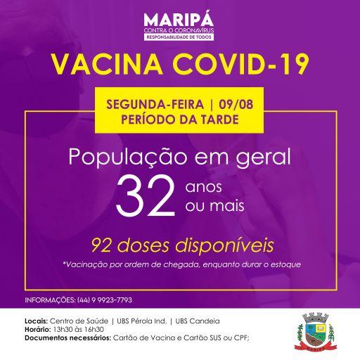 Com a chegada da 34ª remessa de vacinas contra a covid-19, o Município de Maripá irá ampliar a vacinação para pessoas com 32 anos ou mais na segunda-feira (9). O novo lote contém 92 doses de vacinas fabricadas pela Pfizer e Coronavac.