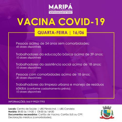 O Município de Maripá começa a vacinar a partir desta quarta-feira (16), pessoas sem comorbidades com 54 anos ou mais. Uma nova remessa de vacinas deve chegar ao município ainda hoje, com a previsão de 105 novas doses, sendo 10 doses da Coronavac/Butantan e 95 doses da AstraZeneca/Fiocruz.