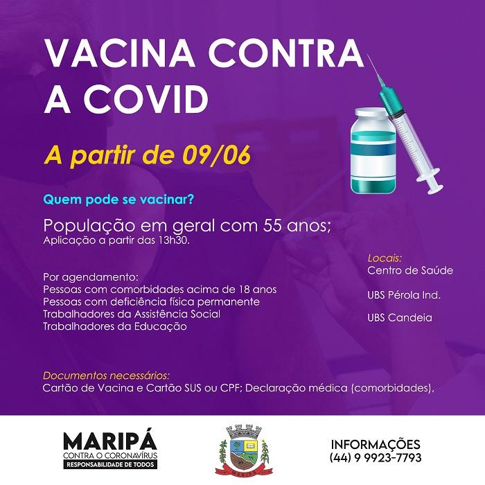 O Município de Maripá começa a vacinar a partir desta quarta-feira (9), pessoas sem comorbidades com 55 anos ou mais. A vacinação da população em geral iniciou nesta segunda-feira (6), com a chegada de novas doses da vacina AstraZeneca/Fiocruz. A vacinação será por ordem decrescente de idade, conforme a disponibilidade de vacinas.