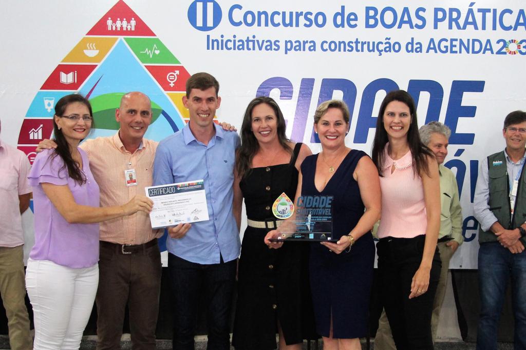 RECONHECIMENTO – Além da premiação pelo projeto vencedor, o Município de Maripá recebeu um troféu em reconhecimento ao destaque na plataforma do Programa Cidades Sustentáveis. A plataforma contém o levantamento de 260 indicadores sociais, econômicos, políticos, ambientais e culturais, alinhados aos 17 Objetivos de Desenvolvimento Sustentáveis (ODS).