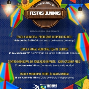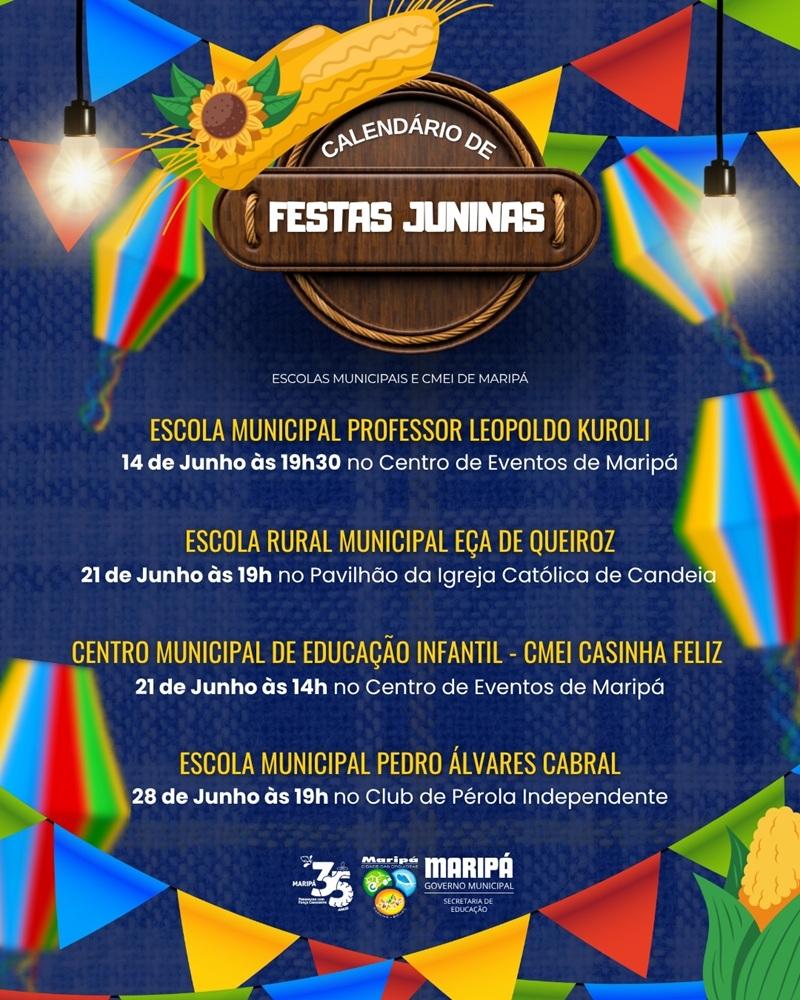 A Administração Municipal de Maripá, por meio da Secretaria de Educação, divulgou o calendário oficial das festas juninas das escolas municipais e do Centro Municipal de Educação Infantil (CMEI). As celebrações acontecerão em diferentes datas e locais, reunindo alunos, educadores e toda a comunidade em momentos de confraternização, apresentações típicas e comidas tradicionais.