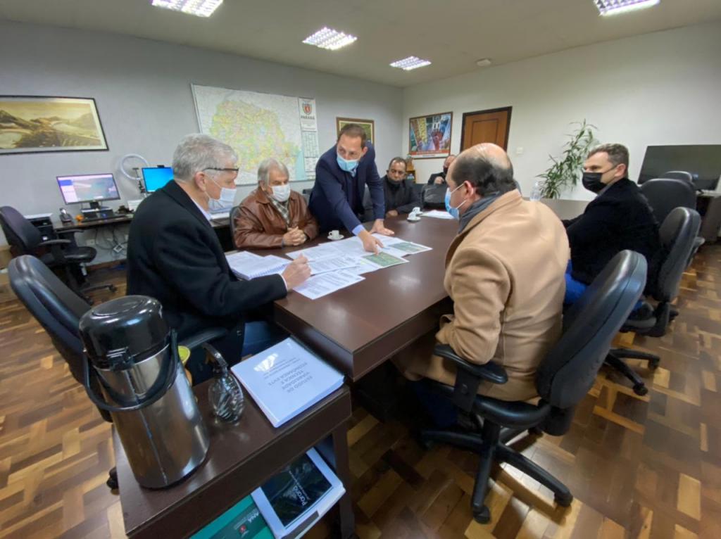PAVIMENTAÇÃO – A agenda também contemplou audiência com o secretário estadual da Agricultura e do Abastecimento (Seab), Norberto Ortigara juntamente com o secretário estadual da Administração e Previdência, Marcel Micheletto e o prefeito de Palotina, Dr. Luiz Ernesto Giacometti. O objetivo foi buscar uma parceria para a pavimentação com pedra irregular da MR 318, na Linha Kennedy, estrada de divisa entre Maripá e Palotina. O trecho possui mais de 4,9 quilômetros de extensão e requer um investimento aproximado de R$ 1 milhão de reais para a pavimentação, recurso este confirmado pelo secretário Ortigara através de uma parceria entre município/estado por meio da celebração de convênios.